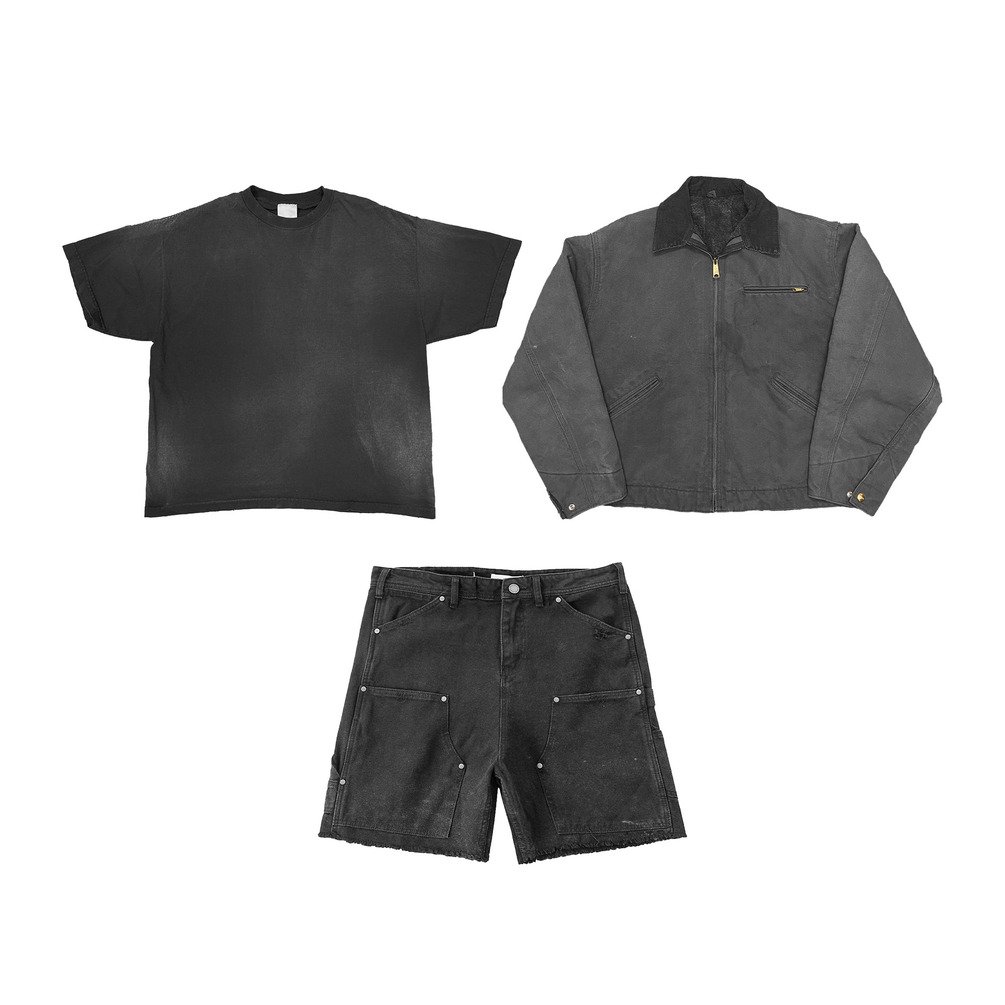 -Vintage Tee, Work Jacket, & Carpenter Shorts Mockups